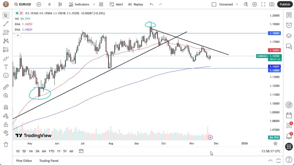 The target to the downside, just being lazy, you could say the 200 day EMA at the 1.1420 level or the 1.14 level where we had seen significant support previously. Breaking that opens up a move to 1.11, which would not be overly surprising to me if we see it. Although I don’t think we get there in the next couple of days. I think this is something that probably takes a few months to play out, possibly even six.